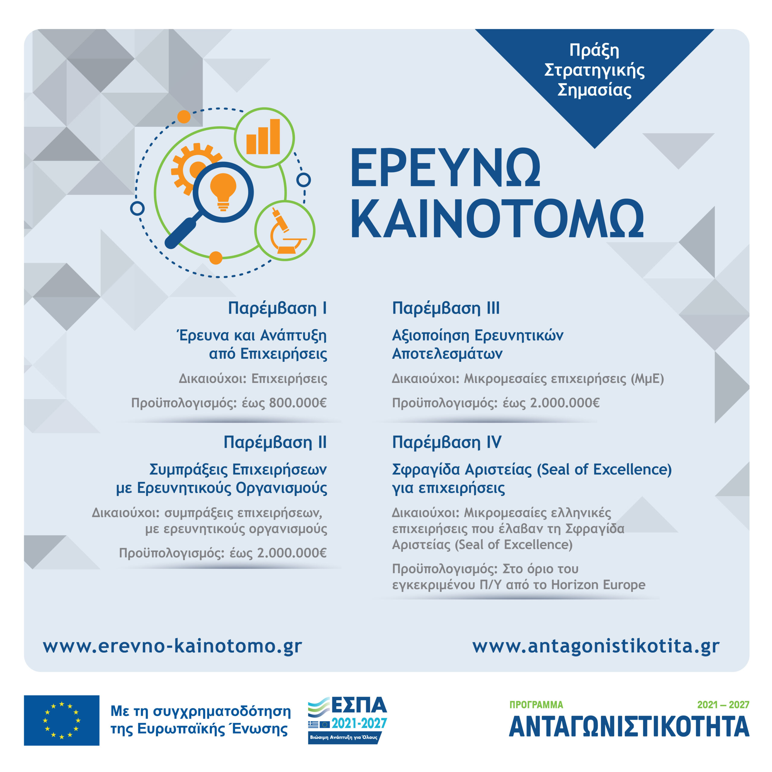 Το “Ερευνώ – Καινοτομώ” αποτελεί Πράξη Στρατηγικής Σημασίας του Προγράμματος Ανταγωνιστικότητα (ΕΣΠΑ 2021-2027).